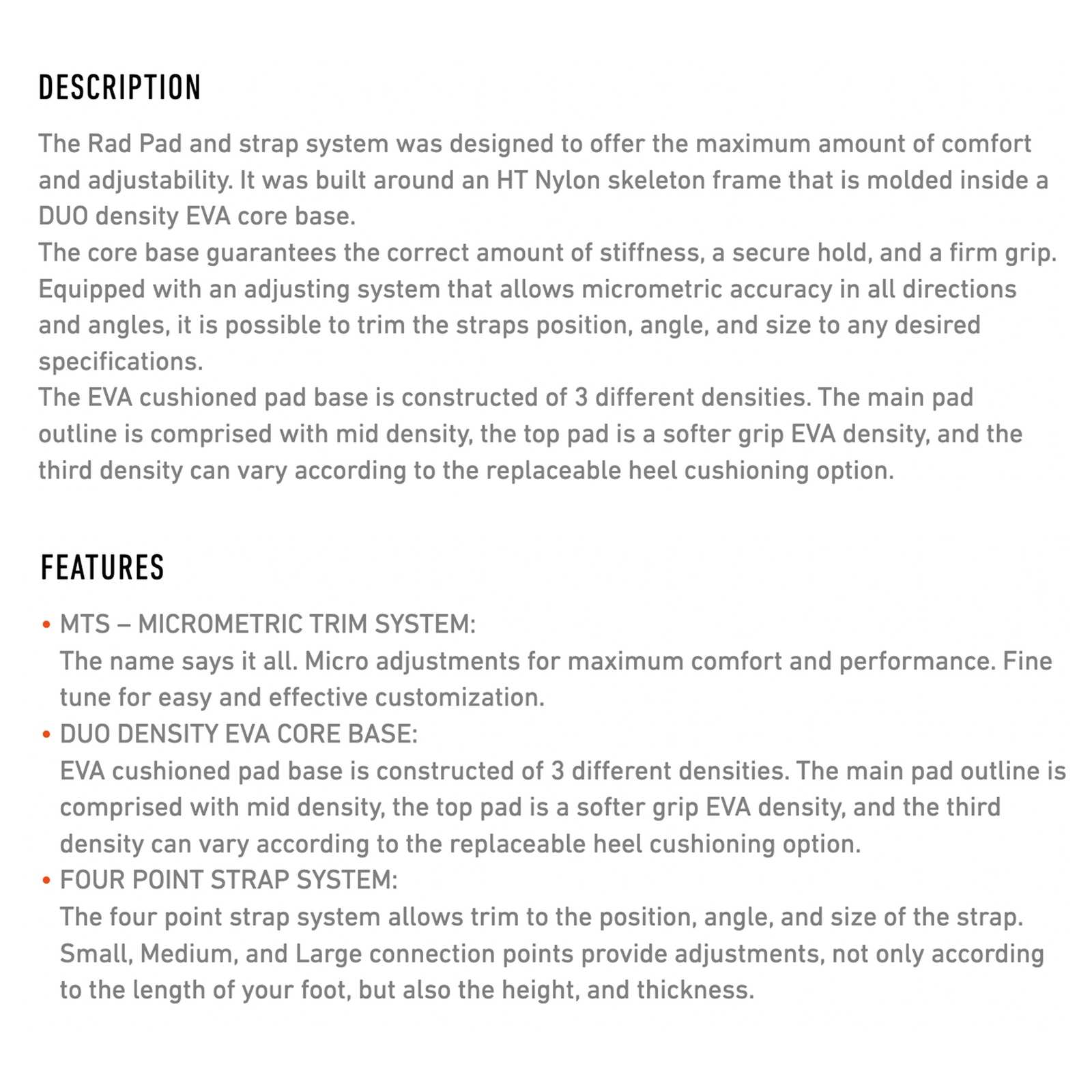 El Sistema Rad Pad y correa para kiteboards RRD 25RADP ha sido diseñado para ofrecer una experiencia de kitesurf inigualable, priorizando la comodidad y la ajustabilidad. Su construcción se basa en un esqueleto de nylon HT, que está moldeado dentro de una base central de EVA de doble densidad, asegurando una rigidez adecuada y un agarre firme. Este sistema incorpora tecnologías innovadoras, como el MTS (Micrometric Trim System), que permite ajustes milimétricos en todas las direcciones, facilitando la personalización de la posición, ángulo y tamaño de las correas. La base de la almohadilla está compuesta por tres densidades diferentes de EVA, proporcionando una excelente amortiguación y soporte, lo que mejora tanto el rendimiento como la durabilidad del producto. Ideal para kitesurfistas que buscan una adaptación precisa y comodidad durante sus sesiones de surf.