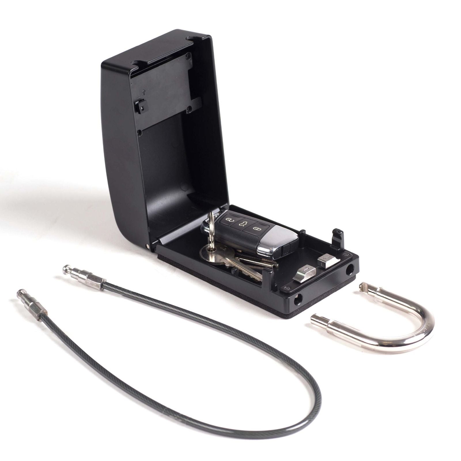 Principales caractéristiques: - Construction tout métal résistante et hydrofuge pour une sécurité durable. - Double système d’attache: anse revêtue et câble, pour s’adapter à de multiples points de fixation. - Code à 4 chiffres avec 10 000 combinaisons, sans besoin de clé physique. - Dos en mousse et anse/câble revêtus pour protéger les surfaces du véhicule. - Compartiment interne optimisé, compatible avec la plupart des clés (y compris clés intelligentes/FOB). - Pochette de blocage de signal incluse (type Faraday) pour contrer la capture de signal des clés sans contact. - Conception portable et compacte: se range facilement dans la boîte à gants. - Installation rapide et intuitive: s’attache à la roue, au toit/porte-bagages, au châssis, à la remorque, etc. - Idéal pour les sports nautiques et outdoor où la sécurité des clés est cruciale.