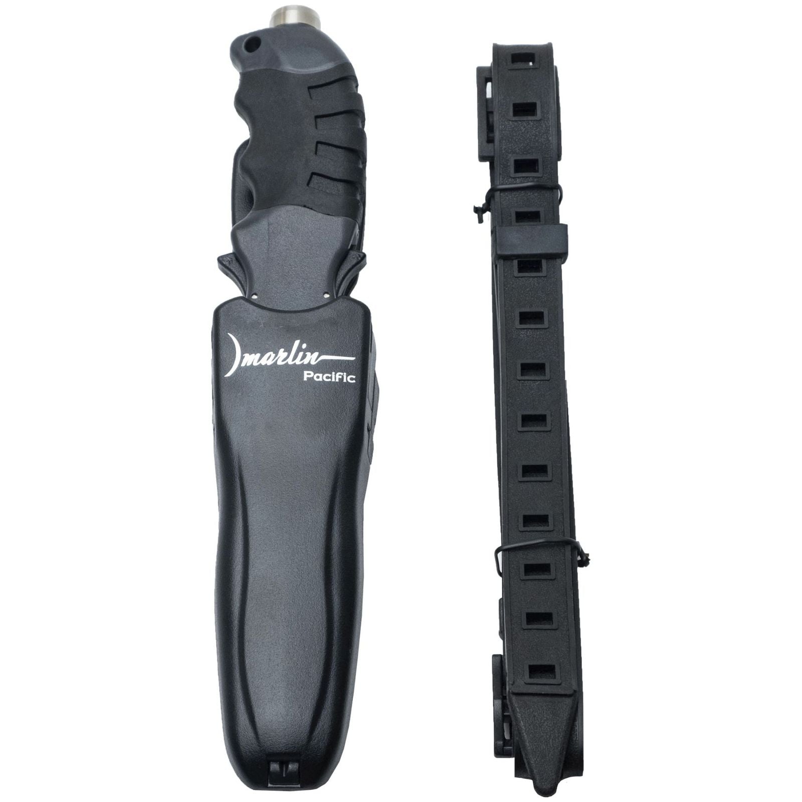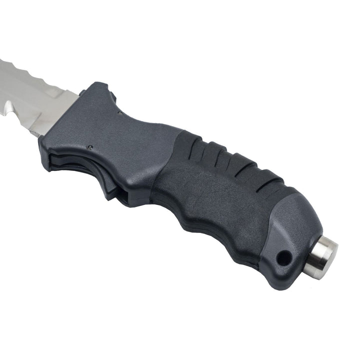 The Marlin PACIFIC Spearfishing Knife is engineered for both seasoned divers and avid fans of underwater exploration, delivering unmatched reliability and versatility in extreme conditions. Crafted from durable 420 stainless steel, the blade features a dual-edged design—one side provides a clean edge for precise cuts, while the serrated side excels in tackling tough materials. The ergonomic handle, made with plastic and TPR, ensures a comfortable grip while maintaining safety, even when wet or worn with gloves. With a secure locking system and a quick-release sheath, this knife is ready to be drawn with one hand in emergency situations. Moreover, the built-in hammer feature on the handle allows divers to signal their presence effectively underwater. Its adaptable mounting options make the PACIFIC knife an essential tool for any spearfishing or diving expedition.